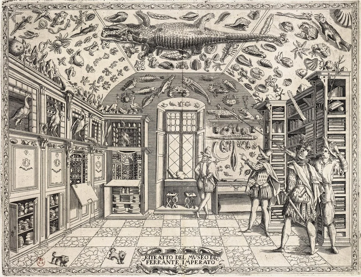 By the mid-sixteenth century, this instinct to collect expanded into the cabinet of curiosities, also known as the Wunderkammer. Unlike the studiolo, the cabinet presented a more encyclopedic and diverse scope. Common objects included natural specimens, minerals, taxidermy, ethnographic artifacts, scientific instruments, devotional objects, and artworks that coexisted within these dense displays. These collections were organized less by discipline and more by wonder and curiosity. The Wunderkammer aimed to present the world through fascination, spectacle, and juxtaposition.